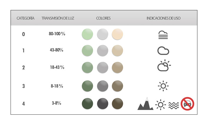 Es recomanen ulleres de sol amb filtre 3 o 4 per protegir adequadament dels rajos UV que reboten sobre la neu o gel i perjudiquen encara més la visió.