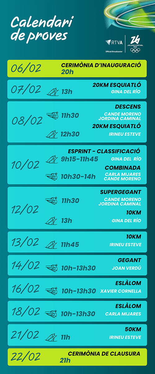 Aquest calendari recull la previsió de les proves esportives dels Jocs Olímpics d'Hivern Milano Cortina 2026 on participen atletes andorrans. Els horaris estan subjectes a modificacions.
