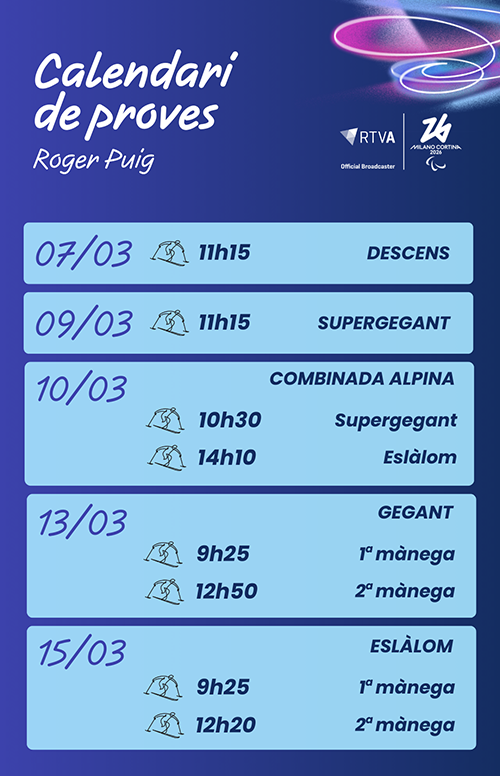 Aquest calendari recull la previsió de les proves esportives dels Jocs Paralímpoics d'Hivern Milano Cortina 2026 on participa l'atleta andorrà Roger Puig. Els horaris estan subjectes a modificacions.