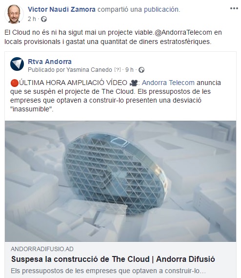 El conseller d'SDP. Víctor Naudi, ha expressat la seva opinió a través de les xarxes socials. Recorda que la formació mai havia considerat The Cloud "un projecte viable" i critica també el malbaratament de diner públic.