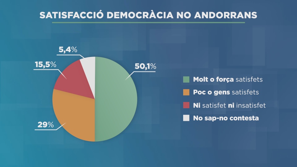 La majoria d'andorrans, un 45%, està satisfet amb el funcionament de la democràcia, però hi ha un nombre creixent que no ho està. Suposen quatre de cada deu, i aquesta dada ha anat a l'alça el darrer any. Els enquestats revelen que els principals motius són de caràcter social. Sobretot, la qüestió de l'habitatge, després les desigualtats. El segon és que una proporció de la població té la imatge que es governa, sobretot, de cara a les persones més benestants.