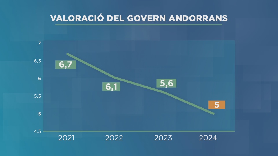 Una altra dada que destaca és que els nacionals donen un aprovat justet a l'executiu quan el 2021 la nota que donaven era d'un 6,7. Però s'ha de tenir en compte que eren els anys de la pandèmia, quan la ciutadania va demostrar una gran satisfacció sobre com l'afrontava l'executiu. Els no andorrans aproven amb més contundència, un 6, la tasca del Govern.